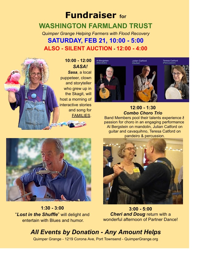The Quimper Grange is hosting a benefit-day fundraiser for the farmlands that experienced flood damage late last year. The recipient of the day’s funds is the Washington Farmland Trust, a 501(c)3 organization: https://wafarmlandtrust.org/help-farmers-recover-floods/